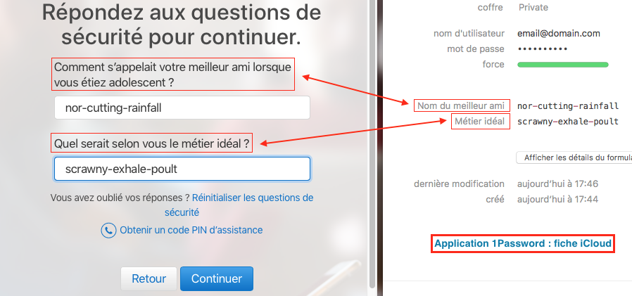 Les bons gestionnaires de mots de passe (comme le toujours excellent 1Password notamment) permettent d’ajouter des champs libres à chaque fiche de compte. Ainsi, vous pouvez indiquer le texte de la question retenue en guise d’étiquette et la réponse générée en guise de mot de passe. Lorsqu’une vérification d’identité sera nécessaire, comme dans l’exemple ci-dessous pour un compte iCloud, il suffira de retrouver la bonne réponse en fonction des questions choisies par le site, comme ceci :